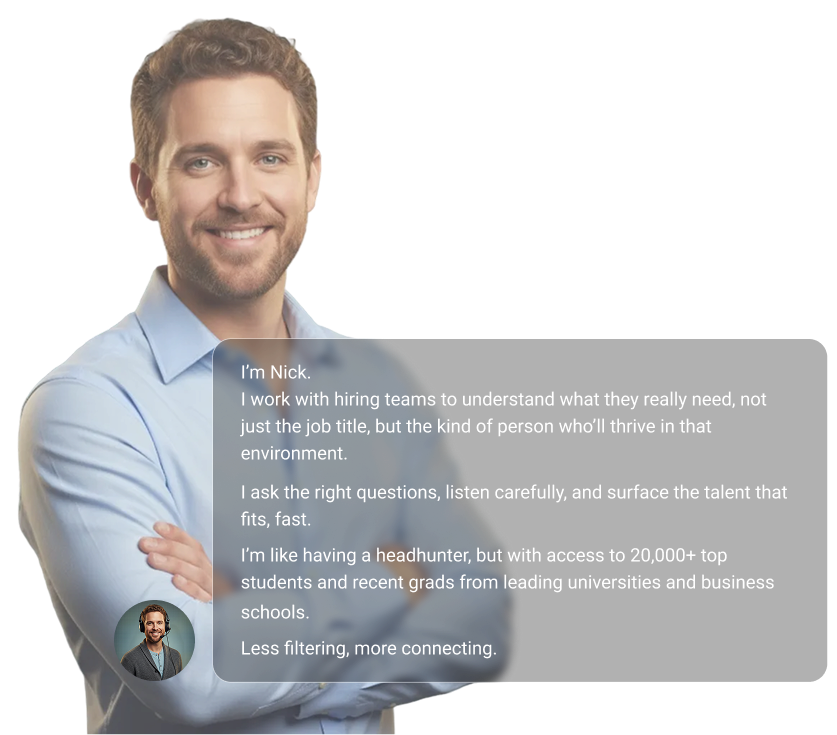 Nora listens to students and helps them see their strengths. Nick works with employers to find the one person who’ll thrive in their team. Together, they make career matching feel effortless.