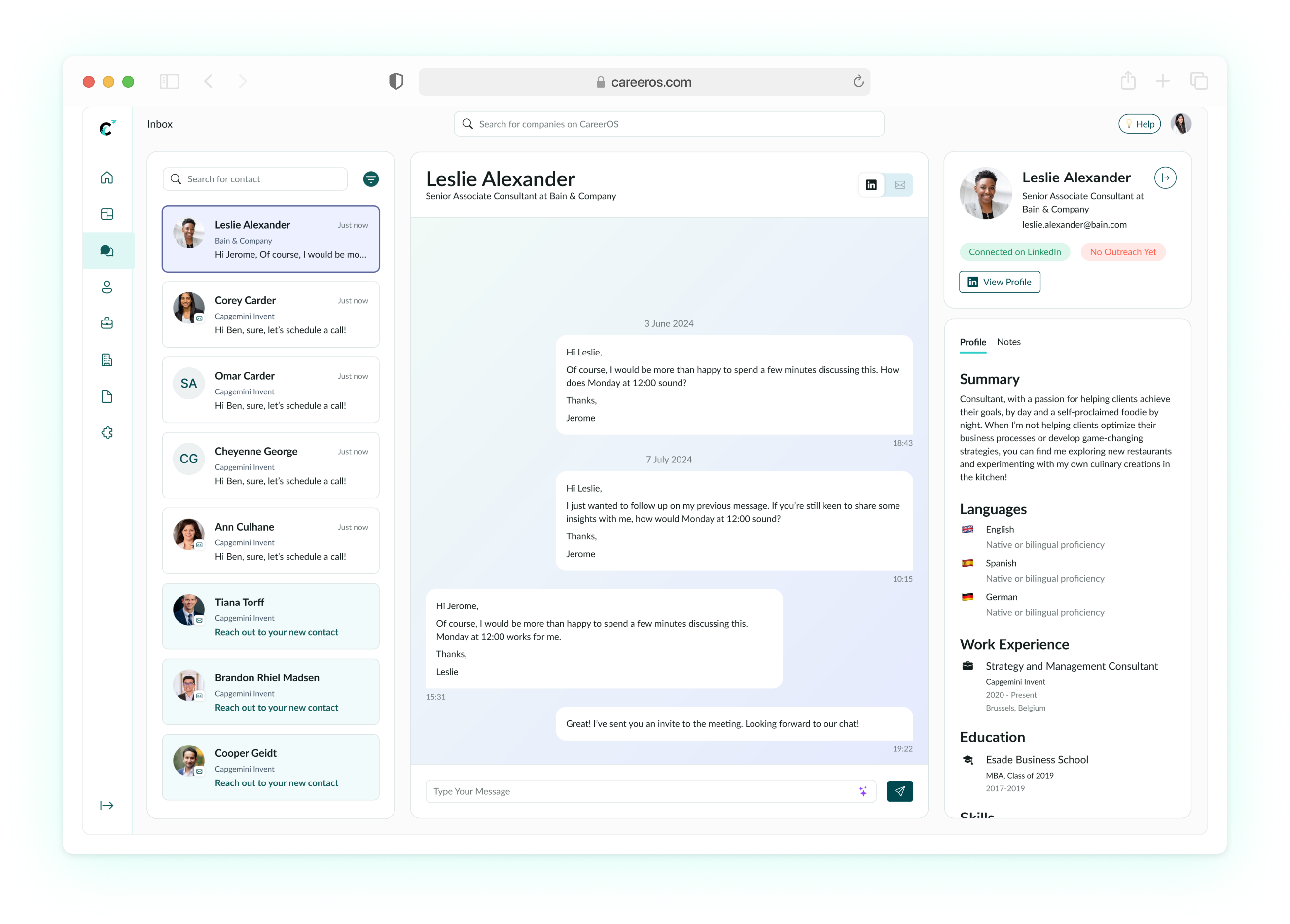Students get smart contact suggestions and reach out with built-in email and LinkedIn integrations. Networking made less awkward, more effective.